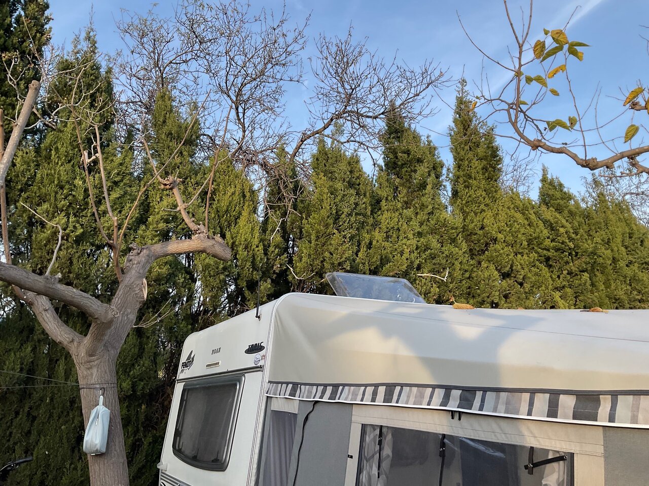 Misschien een fijnmazig net tussen de boom en jouw caravan spannen. Zodat ze niet op het dak springen. Een net (qua mazen) wat ze hier gebruiken over fruitbomen tegen spreeuwen. Niet te kleine mazen ivm de wind.