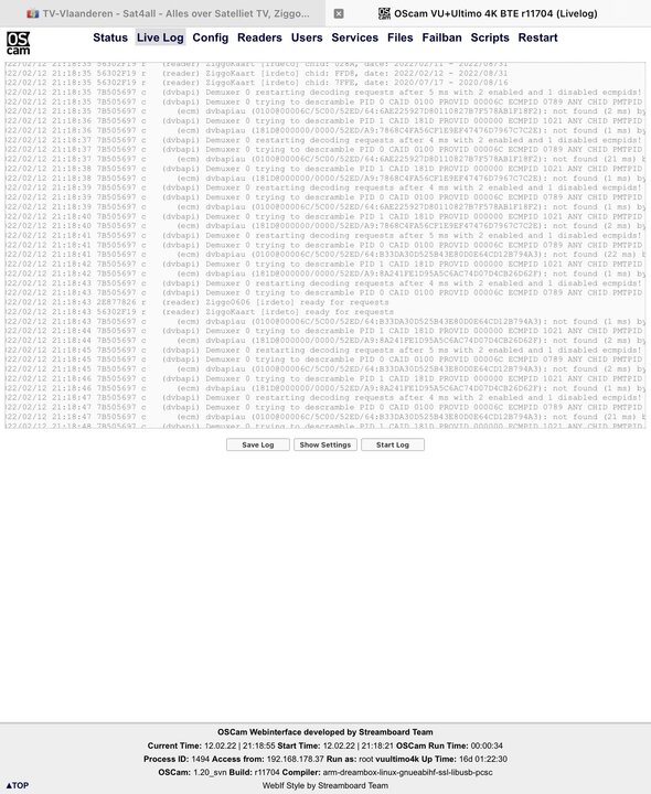 Mimisiku Geplaatst: 13 februari 2022 Geplaatst: 13 februari 2022 (aangepast) Even een M7 module geleend. Daarmee gaat Sport10 open… Terug in de kaartlezer, geen Sport10… Oscam.dvbapi heeft al tijden de mapping (Eleven Sports Opent prima).. Nog even geen idee waarom hij via OScam niet wil… Update: Genaaid door mijn eigen ‘accuratesse’. Ik gebruik services voor iedere provider. Typfoutje gemaakt in de services lijst van TV-Vlaanderen. 52E0 i.p.v. 52ED (dat zal me leren mijn bril op te zetten) Aangepast, OScam restart en binnen 10 seconden beeld.. In mijn geval dus ‘case closed’.. 13 februari 2022 aangepast door Mimisiku Oplossing Afscheid….. Nog een paar maandjes te gaan…
