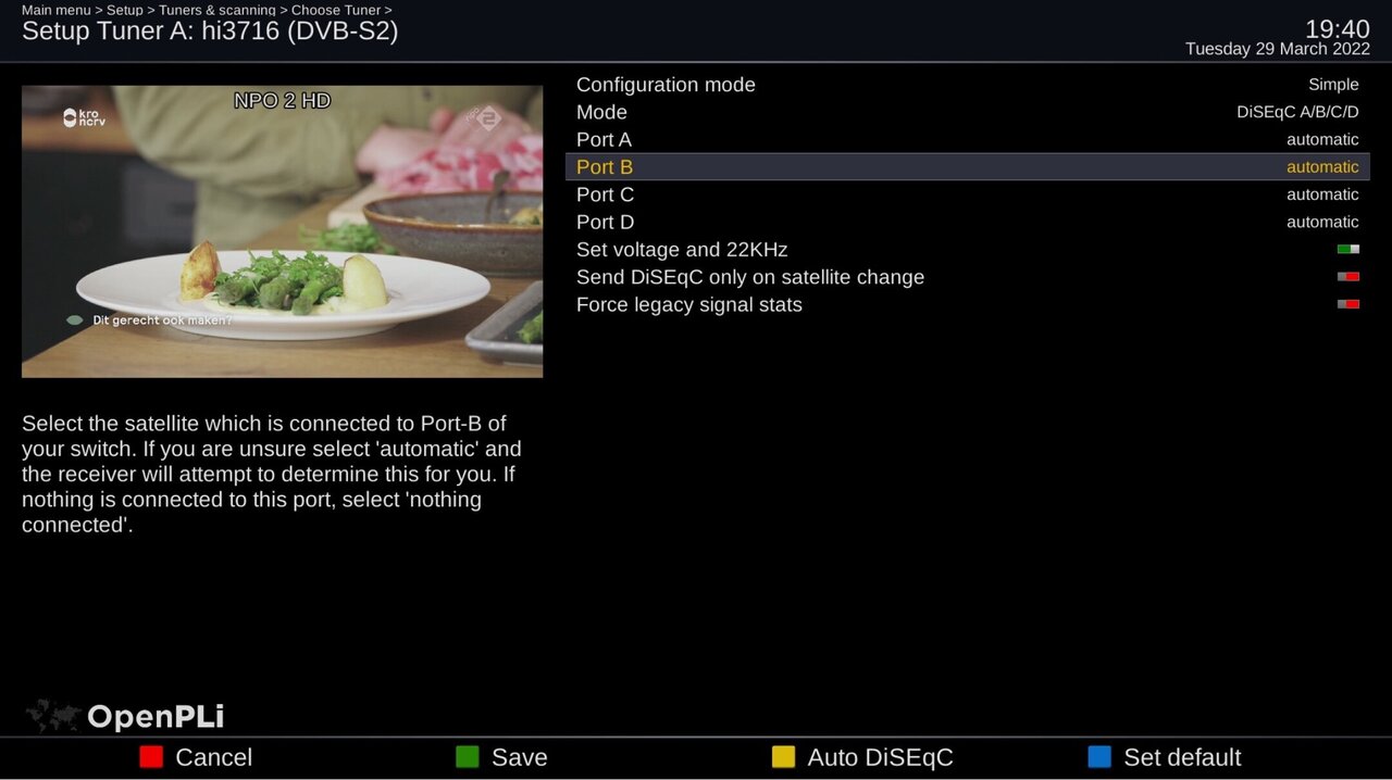 John van Dreumel Geplaatst: 29 maart 2022 Geplaatst: 29 maart 2022 Ik geloof nog steeds niet in de voeding dus dat kan altijd nog. Heb jij die box al eens vers geflasht en tijdens de setup gekozen voor autodiseqc? Wie weet heb jij je wel vergist in de aansluitingen. Zeker nu jij op ‘Astra 23.5’ een aantal Engelse zenders van Astra 28.2 had gevonden. Probeer nu gewoon eens iets uit en laat de bevinding weten. Wat je ook kunt doen is niet flashen en in de huidige image via menu - instellingen - tuners en zenders zoeken - tunerconfiguratie en alle poorten op automatic zetten en op geel en daarna groen te drukken. Dit duurt een minuut of zo. Indien AutoDiseqc goed werkt en de switch is in orde dan wordt iedere poort juist gekozen en hoef je niet te twijfelen aan jouw setup. Ik twijfel namelijk wel aan jouw bevindingen. 🤭 Er is zoveel te vragen dat ik het tóch eerst zelf probeer uit te zoeken. Dat is ook verrekte leerzaam. Mijn boxen zijn allemaal powered by PLi.