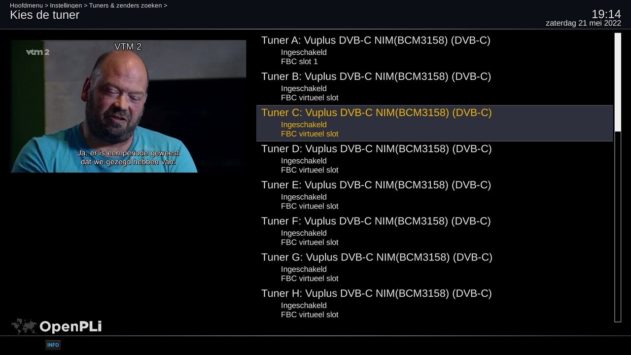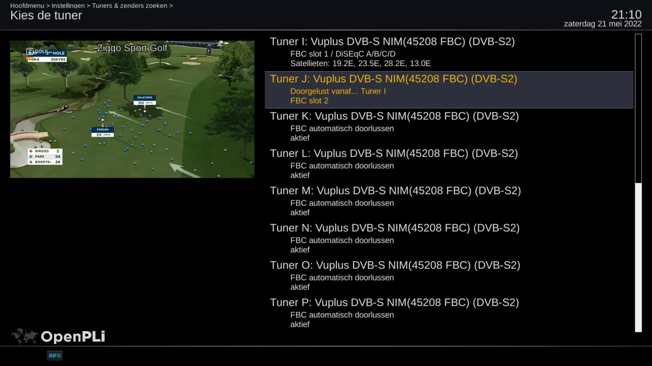 Mathjanssen Geplaatst: 21 mei 2022 Auteur Geplaatst: 21 mei 2022 Ik weet zeker dat welke softcam dan ook, er niks mee te maken heeft. Er zit een DVB- C tuner in en de volgende DVB-S Ik heb het in mijn informatie alleen over opnemen via de sat dus DVB-S In het tuner menu staat de volgende info. Tuner A-H Vuplus DVB-S nim(7376 FBC) Tuner I Vuplus DVB-C nim (TT2L08) (multitype DVN-C/T2) De sat antenne kabel gaat naar de Sat Tuner van de ontvanger. ( Er is 1 in en 1 out aansluiting) MJ