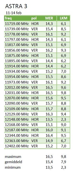 Old Satterhand Geplaatst: 23 februari 2023 Geplaatst: 23 februari 2023 (aangepast) Het gekke is dat de zenders die je niet goed ontvangt niet eens op de zwakste transponders staan. Het betreft de 12090V en 12129V. Op onderstaand lijstje kun je zien wat de ontvangst van Astra 3 transponders zou kunnen zijn op een goed afgestelde 80 cm schotel. Dat zal voor jou wellicht niet haalbaar kunnen zijn, maar geeft wel een goede indicatie. De 12148H betreft een 16APSK data transponder, die kan je niet ontvangen. Om nou niet te veel overhoop te halen, zou ik de LNB gewoon met een smartphone op 6 graden rechtsom afstellen. Dat is echt de grootste winst die je in deze situatie kunt bereiken. Het heeft weinig zin om de LNB anders te monteren. Het maakt voor zo'n grote schotel hooguit een paar tiende dB uit. MER = Signaal kwaliteit LKM = LinkMargin, regenreserve 23 februari 2023 aangepast door Old Satterhand typo