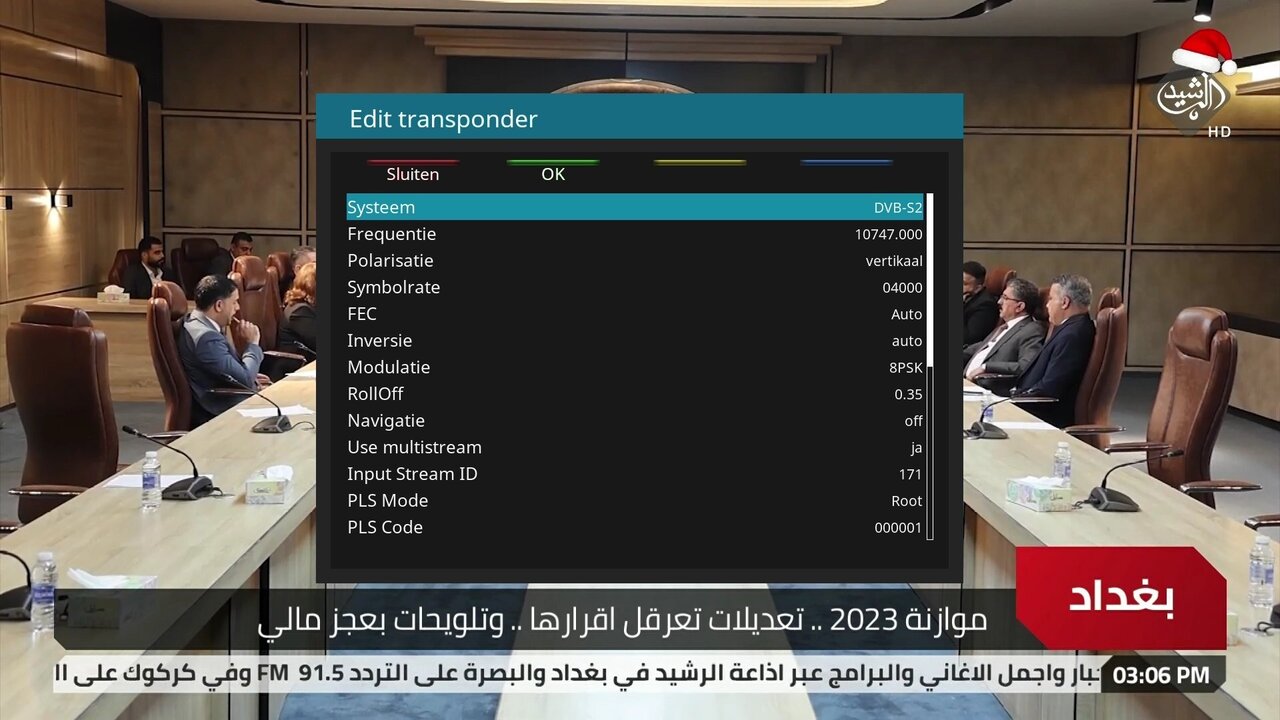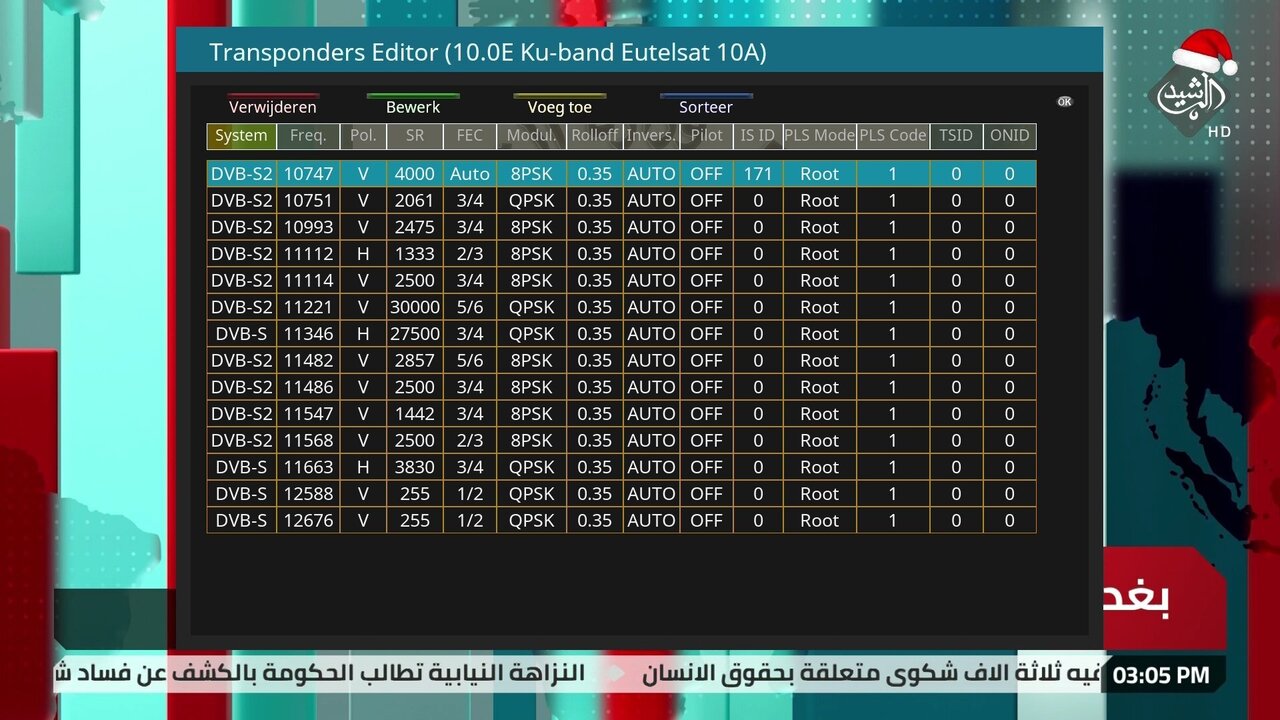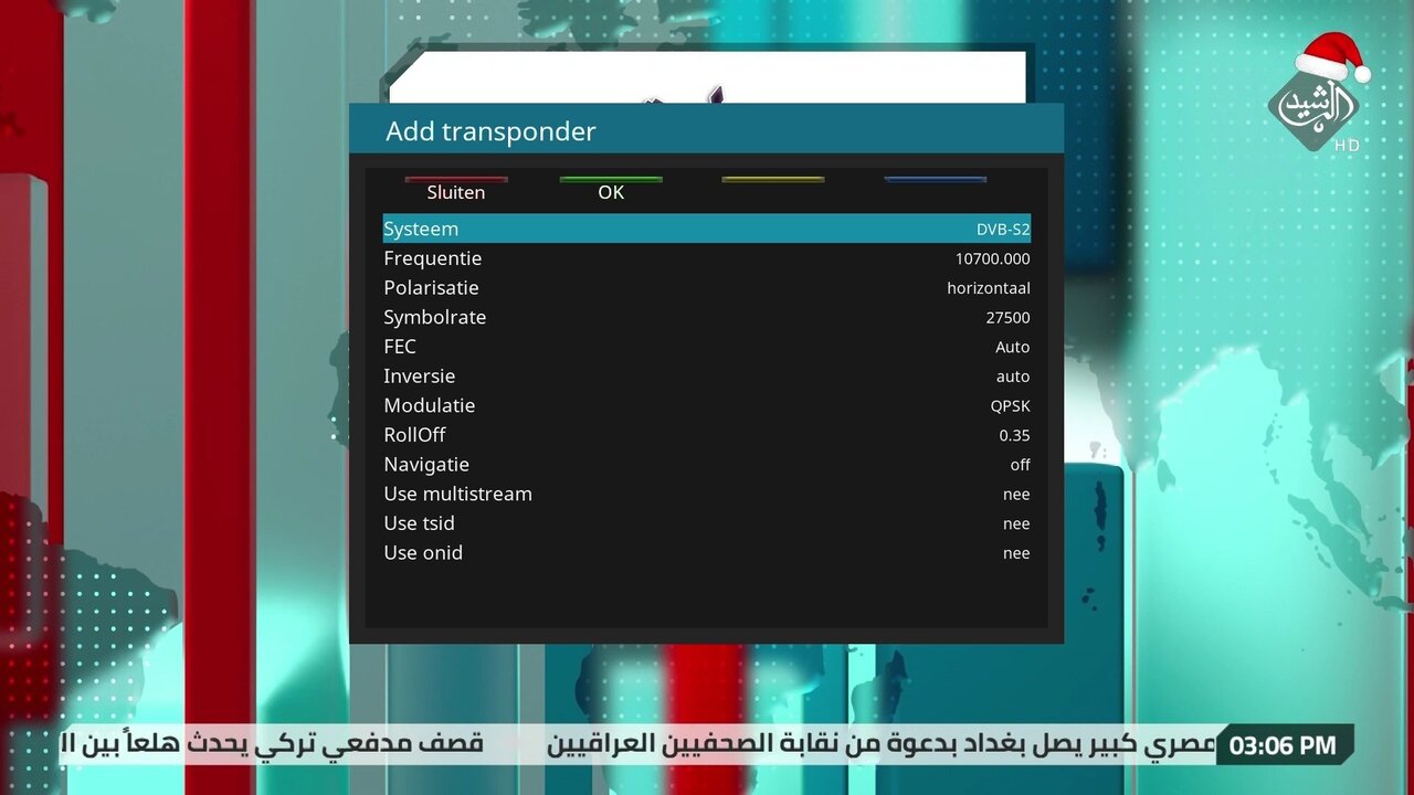 Alex1970 Geplaatst: 13 december 2022 Geplaatst: 13 december 2022 2. Deze instelling dus Dreambox DM920: 2x Triple tuner (2x DVB-S2X multistream + DVB-C/T2) OpenPLi 9 Xtrend ET10000: 1x DVB-S2, 2x DVB-C/T2, IPTV OpenPLi 9 VU+ Duo / Dreambox DM800 / TBS 5925 Channel Master 180cm offset: 39.0°E-37.6°W, Channel Master 120cm offset: 23.5°E-8°W SAB 97 schotel 45.1°E-60°E, 80cm vast: 28.2°E/23.5°E/19.2°E/13°E | DVB-T/DAB: VHFIII/UHF combi-antenne op zolder.