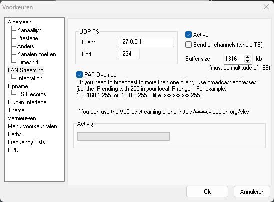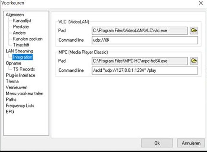 Crazy Sat Geplaatst: 22 januari 2023 Geplaatst: 22 januari 2023 (aangepast) Quote Zo heb ik het ingesteld en werkt goed. Klopt. Niet vergeten om ook het juiste pad in te stellen bij "Integration" zowel bij VLC als bij MPC ( indien je deze gebruikt en nodig hebt ) Als je bij "Tools" kiest voor zowel VLC als voor MPC gaat DVBDream in "Renderless Mode" . Vergeet niet deze modus terug af te vinken bij "Kanalen" bij het gewoon gebruik van DVBDream zonder streaming. 22 januari 2023 aangepast door Crazy Sat feedhunting , a crazy hobby ! Edison OS mio 4K UHD + Octagon SF8008 4K UHD + Dr.HD F15 + Edison OS mini + Technomate TM-5402 HD M3 CI , Moteck SG2100 + Deltastar 90 cm + Invacom C120 QDF-031 Quad lnb + SkyStar HD2,TBS5927 , en TT-budget S2-1600 kaart. Channel Master 180 cm schotel + ESX241 lnb voor C-band. DVB-T2 via Oostvleteren,Egem,Mont des Cats,Bouvigny en Doornik.