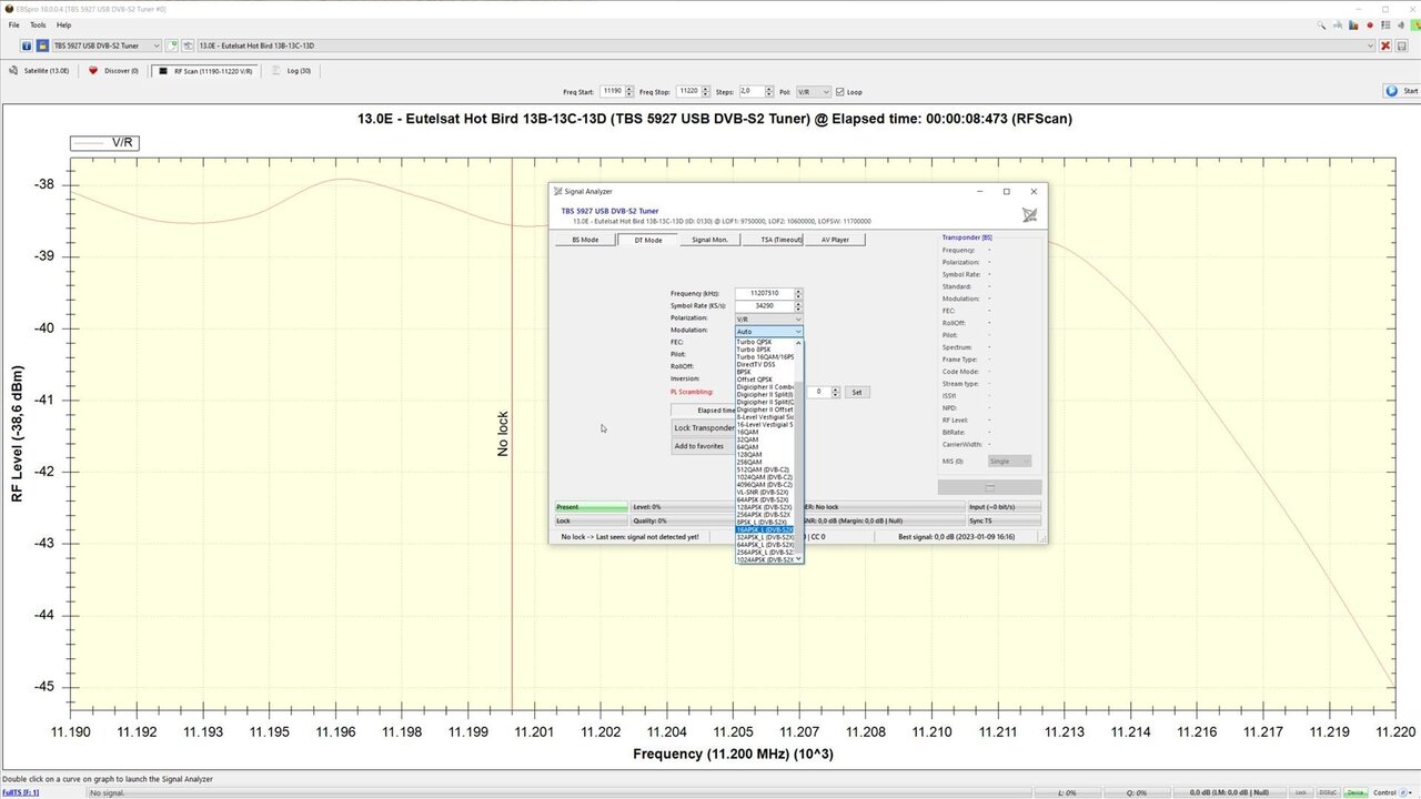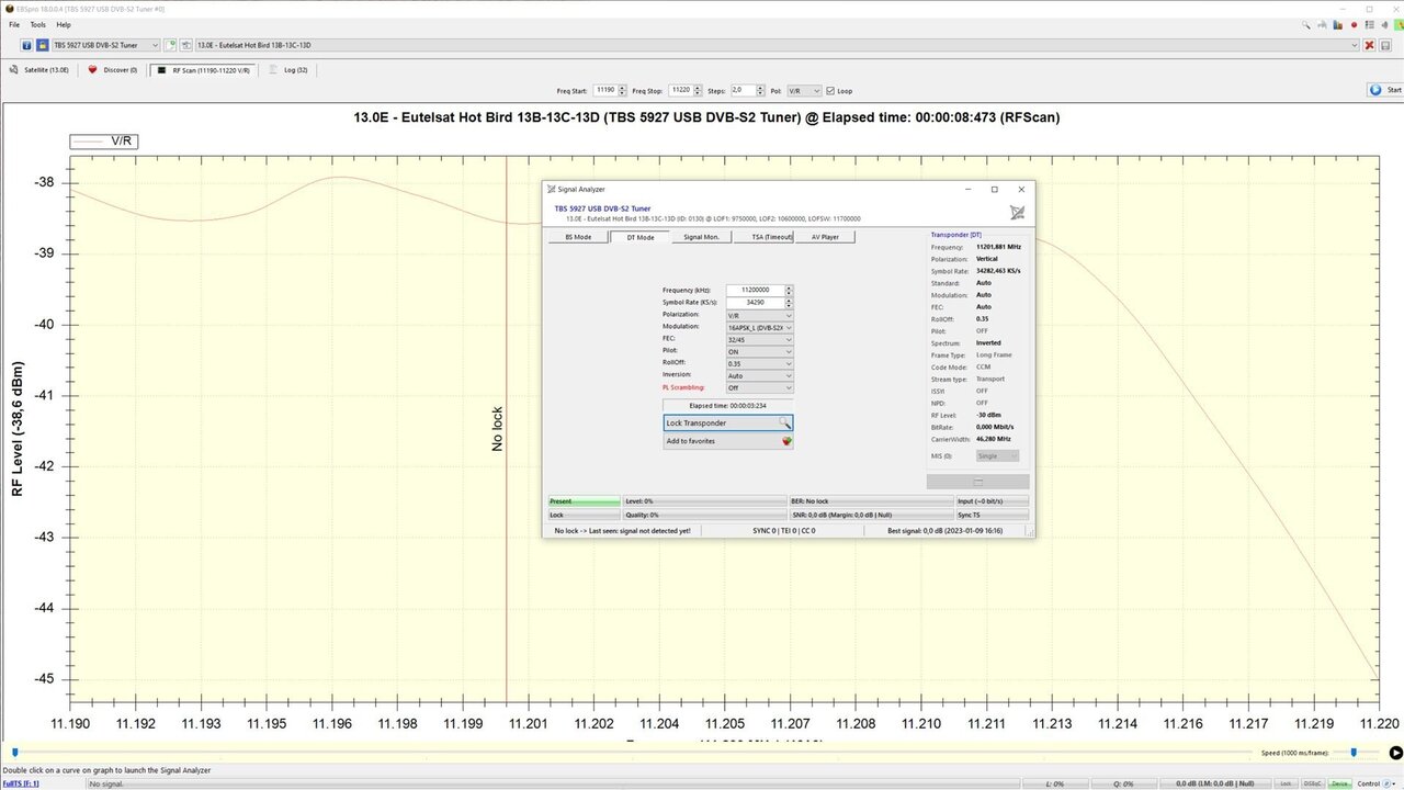 Dat komt door de gekozen modcod (min CNR voor een lock is 9,8 dB) en de ongunstige positie van de LNB op de multifeedarm.
