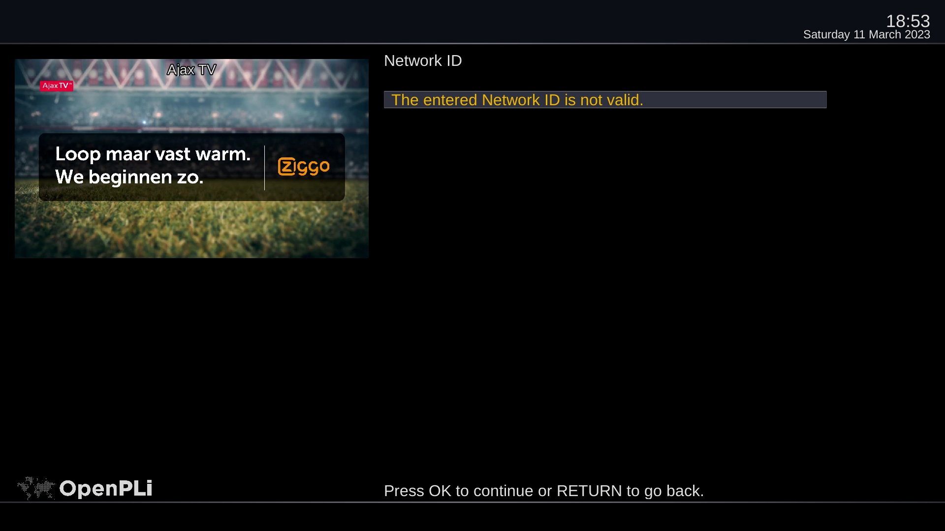Alex1970 Geplaatst: 11 maart 2023 Auteur Geplaatst: 11 maart 2023 Even een update: Ik heb de module in een andere ontvanger gepropt, daar kwam eerst: Deze melding ging pas weg na tig keer op Exit te drukken. Toen afgestemd op Ajax TV en beeld, maar dan direct weer de vraag om Netwerk ID: Daarna de door jou voorgestelde 0555(5) ingevoerd (de laatste 5 ging niet meer) en yes geantwoord op de vraag of ik PIN 05550 wil instellen. En daarna kwam weer de melding van ongeldige Network ID. Die weggeklikt met exit en lijkt nu weg te blijven. Dreambox DM920: 2x Triple tuner (2x DVB-S2X multistream + DVB-C/T2) OpenPLi 9 Xtrend ET10000: 1x DVB-S2, 2x DVB-C/T2, IPTV OpenPLi 9 VU+ Duo / Dreambox DM800 / TBS 5925 Channel Master 180cm offset: 39.0°E-37.6°W, Channel Master 120cm offset: 23.5°E-8°W SAB 97 schotel 45.1°E-60°E, 80cm vast: 28.2°E/23.5°E/19.2°E/13°E | DVB-T/DAB: VHFIII/UHF combi-antenne op zolder.