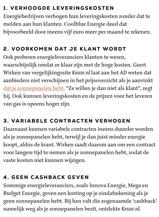 gerrit B Geplaatst: 19 oktober 2023 Geplaatst: 19 oktober 2023 Probeer het zelf maar eens Vul in dat je geen zonnepanelen hebt en een contract van 3 jaar wil en kijk hoeveel aanbiedingen je krijgt. Herhaal dit met dat je wel zonnepanelen hebt en kijk wat er nog over blijft. zondag? nee dan kan ik niet dan ben ik vissen