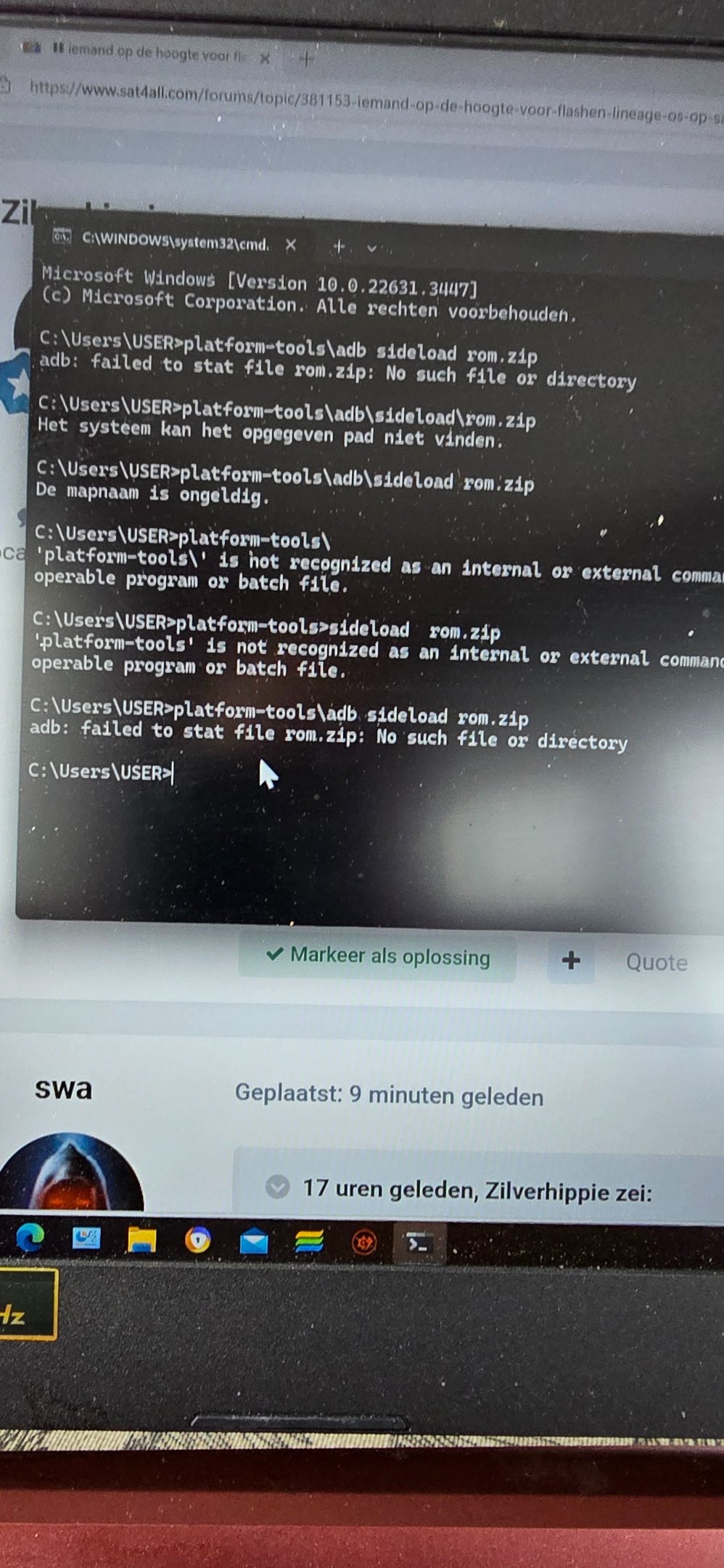 swa Geplaatst: 26 april 2024 Auteur Geplaatst: 26 april 2024 4 uren geleden, Zilverhippie zei: Je bent nu in de directory C:\Windows\System32\. Ofwel navigeer je eerst naar de directory waarin zich de rom bevindt: cd C:\Pad\Naar\Directory\Van\Rom\ en vervolgens adb sideload rom.zip Ofwel blijf je in C:\Windows\System32\ en geef je de opdracht adb sideload C:\Pad\Naar\Directory\Van\Rom\rom.zip Zolang jij het niet anders aangeeft "denkt" adb dat de rom zich bevindt in de directory waarin je momenteel vertoeft. sorry ben daar niet goed in maar heb het programma map platform-tools gekopierd naar c:\ platform-tools> in configuratie \systeem geanvanceerde systeem instellingen omgevingvariabelen het path bewerkt naar c:\platform-tools> ik heb in die map ook die rom.zip en gapps.zip ingezet. moeten die rom en gapp zip dan ergens anders komen te staan dan. alvast bedankt dat je wil helpen mvg swa
