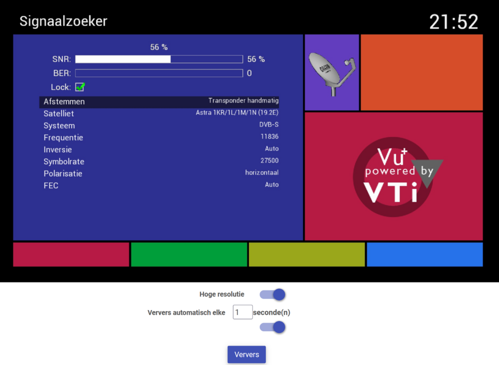 Alex1970 Geplaatst: 16 september 2024 Geplaatst: 16 september 2024 Maak eens wat duidelijker met screenshots. Van je tuner instellingen en die signaalmeter wat er niet werkt. Zorg dat je ontvanger up-to-date is. Maak eens een foto van de LNB. Dreambox DM920: 2x Triple tuner (2x DVB-S2X multistream + DVB-C/T2) OpenPLi 9 Xtrend ET10000: 1x DVB-S2, 2x DVB-C/T2, IPTV OpenPLi 9 VU+ Duo / Dreambox DM800 / TBS 5925 Channel Master 180cm offset: 39.0°E-37.6°W, Channel Master 120cm offset: 23.5°E-8°W SAB 97 schotel 45.1°E-60°E, 80cm vast: 28.2°E/23.5°E/19.2°E/13°E | DVB-T/DAB: VHFIII/UHF combi-antenne op zolder.