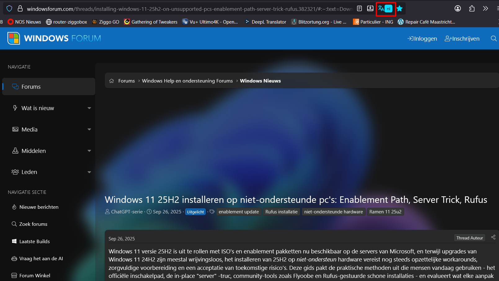 Tonskidutch Geplaatst: 3 uren geleden Geplaatst: 3 uren geleden schakel vertalen in als je deze site leest https://windowsforum.com/threads/installing-windows-11-25h2-on-unsupported-pcs-enablement-path-server-trick-rufus.382321/#:~:text=Download Windows 11 25H2 ISO from Microsoft and,drive letter if necessary%2C e.g. E%3Asetup.exe %2Fproduct server). !!!!!!!!!!!!!!!!!!!!Voor Optie 2 ‘bestanden en apps behouden’ heb je geen backup nodig!!!!!!!!!!!!!!!!!!! Optie 2 server truuk ! 1 ) download de (Multi Edition) ISO van Windows 11 2 ) het gedownloade bestand met rechtermuisklik koppelen 3 ) gebruik de cmd line en ga naar het aangekoppelde ISO mapje 4 ) type dan letterlijk; setup.exe /product server 5 ) Volg de instructies op het scherm en selecteer de juiste optie ‘bestanden en apps behouden’ om een in-place upgrade uit te voeren. !!!!!!!!!!!!!!!!!!!!Voor Optie 4 dus met Rufus heb je een backup nodig!!!!!!!!!!!!!!!!!!! Optie 4 rufus bootable USB stick! <> als de gekozen taal en de Windows versie niet kloppen kan het zijn dat je geen bestanden en apps kunt behouden 1 ) download de (Multi Edition) ISO van Windows 11 2 ) maak met Rufus.exe een bootable USB stick 3 ) Klik op Start en — wanneer u de Windows User Experience-opties van Rufus te zien krijgt — vink dan ‘Remove requirement for 4GB+ RAM, Secure Boot, and TPM 2.0’ (Vereiste voor 4 GB+ RAM, Secure Boot en TPM 2.0 verwijderen) en eventuele andere gewenste opties aan (automatische BitLocker uitschakelen, lokale accountfallback inschakelen, enz.). 4 ) start de computer opnieuw op en gebruik de F9 F10 toetsen om de bootvolgorde op de USB te zetten. Save and exit. 5 ) de USB installatie van Windows 11 wordt gestart 6 ) Volg de instructies op het scherm Quote 4) Rufus-gebouwde USB (schone installatie of ter plaatse uitvoeren van setup.exe vanaf USB) — de meest flexibele optie voor een schone installatie Wat Rufus biedt: Rufus kan een Windows 11 ISO naar een USB schrijven en biedt sinds versie-updates met “uitgebreide” opties een menu waarmee de installatieprogramma's niet meer controleren op TPM, Secure Boot, RAM en soortgelijke vereisten. De Rufus-interface bevat ook opties om de mogelijkheid om een lokaal account aan te maken te herstellen en om automatische vragen over apparaatversleuteling over te slaan. Hoe Rufus te gebruiken voor 25H2 op niet-ondersteunde hardware (beknopte stappen): Download Rufus (installatieprogramma of draagbaar). Als u de ISO niet hebt, gebruik dan de ingebouwde ISO-downloader van Rufus of haal eerst de 25H2 ISO op bij Microsoft. Plaats een USB-stick van 8 GB of meer en selecteer deze in Rufus. Kies de 25H2 ISO als bron. Klik op Start en vink, wanneer de Windows User Experience-opties van Rufus worden weergegeven, ‘Remove requirement for 4GB+ RAM, Secure Boot, and TPM 2.0’ (Vereiste voor 4 GB+ RAM, Secure Boot en TPM 2.0 verwijderen) en eventuele andere gewenste opties (automatische BitLocker uitschakelen, terugvallen op lokaal account inschakelen, enz.) aan. Laat Rufus de USB schrijven en start vervolgens de doel-pc op vanaf de USB voor een schone installatie of open de USB in Windows en voer setup.exe uit voor een in-place upgrade. Voordelen: Creëert een betrouwbaar opstartbaar installatieprogramma dat op meerdere pc's kan worden gebruikt. De optieset biedt gedetailleerde controle (sla TPM/Secure Boot-controles over, terwijl Secure Boot nog steeds functioneel blijft als u het later inschakelt). Waarschuwingen: De Rufus-bypass is afhankelijk van het exacte gedrag van het installatieprogramma; hoewel het in de meeste gevallen werkt, kunnen de routines van Rufus veranderen met nieuwe Windows-services. In zeldzame gevallen melden gebruikers dat de menutekst/methode verandert tussen Rufus-versies; volg de documentatie van Rufus en gebruik een recente stabiele release. !!!!!!!!!!!!!!!!!!!!Voor een backup kun je ook OneDrive gebruiken!!!!!!!!!!!!!!!!!!! afhankelijk van hoeveel data jij op OneDrive kunt plaatsen En anders begin er zelf niet aan als je geen backup kan maken. I had This Thing Röyskopp, Jamie Irrepressible