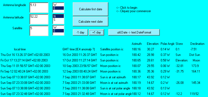 hvdh Geplaatst: 4 september 2003 Geplaatst: 4 september 2003 Skippy, iets is er niet in orde, als ik jou coordinaten hier loslaat op dezelfde applet komt er dezelfde satellietpositie uit, maar andere dagen voor de zon: 12 Oct (elevatie 30.47) en 13 Oct (elevatie 30.1). Op jou screenshot is op 17 Oct de zon al een stuk lager dan Sirius. Ben benieuwd wat hier mis is gegaan. Dr.HD F16, TBS 5927, ET 8500, T-55 voor 9/13/19/23/28/39/42/45°O, Technisat 52/53°O, Laminas 120cm 1°W...68°O.