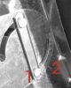 Ik heb even een foto genomen. Je ziet een soort U balkje met aan onder EN bovenkant een soort pijl. (nr 1) Moet deze nu het aantal graden aanwijzen of juist het streepje bij nummer 2 ???